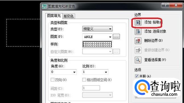 出现“图案填充”面板,点击其中的“添加拾取点”,然后点击一下图形内部,把填充区域选中(如图所示,选中后填充区域被虚线圈闭)。