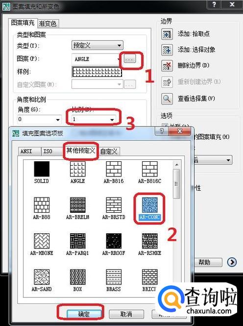 然后点击图案旁边的扩展按钮,如图所示,出现“图案填充选项板”,选择“其他预定义”里面的“AR-CONC”图案,然后设置一下填充图案比例,根据经验设置为0.5(可以根据图形尺寸及显示效果调节)。
