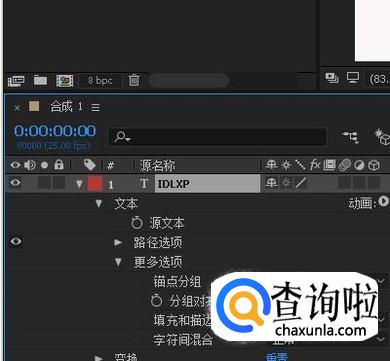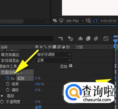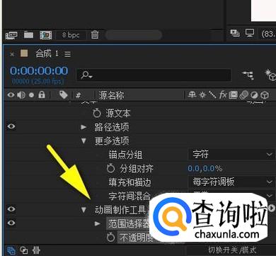 再点开“动画制作工具”的属性;把不透明度设置为0;再在“起始”这里K帧。时间线上的指针移到0秒。