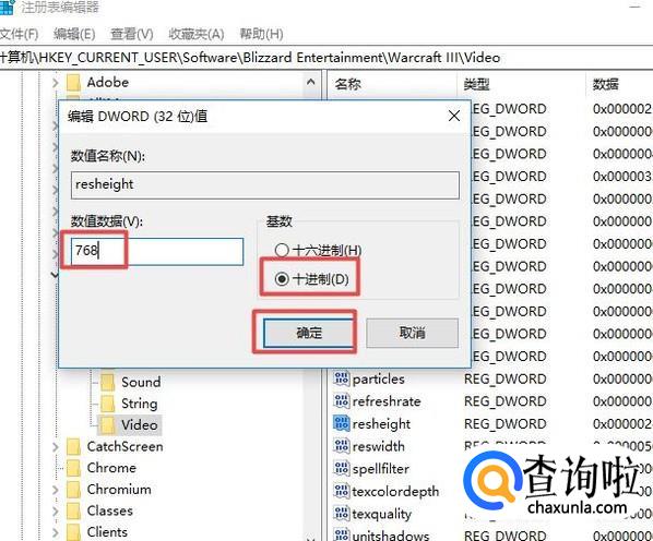 然后我们双击resheight,弹出的界面,我们选择十进制,然后输入768,之后点击确定;