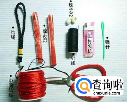 准备一打结线,一根结绳,流苏两根,两个珠子,针和线,打火机,戳针,剪刀。