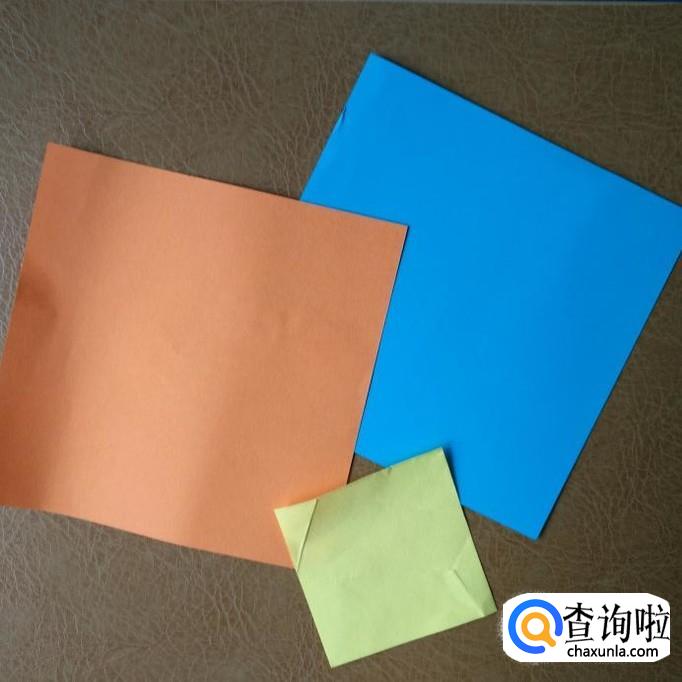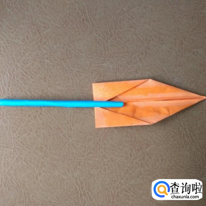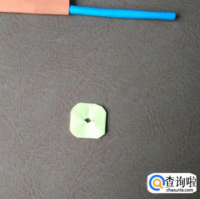 把绿色小正方形纸沿中心线对折2次(使其与刀的大小相配),并将每个面都用胶水互相粘住,然后把四个角修剪成圆形并在中心剪个小孔,最后将其套在刀柄上,大刀就做好了。