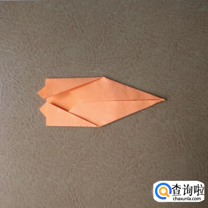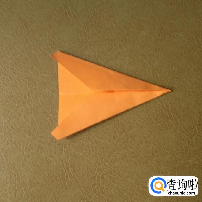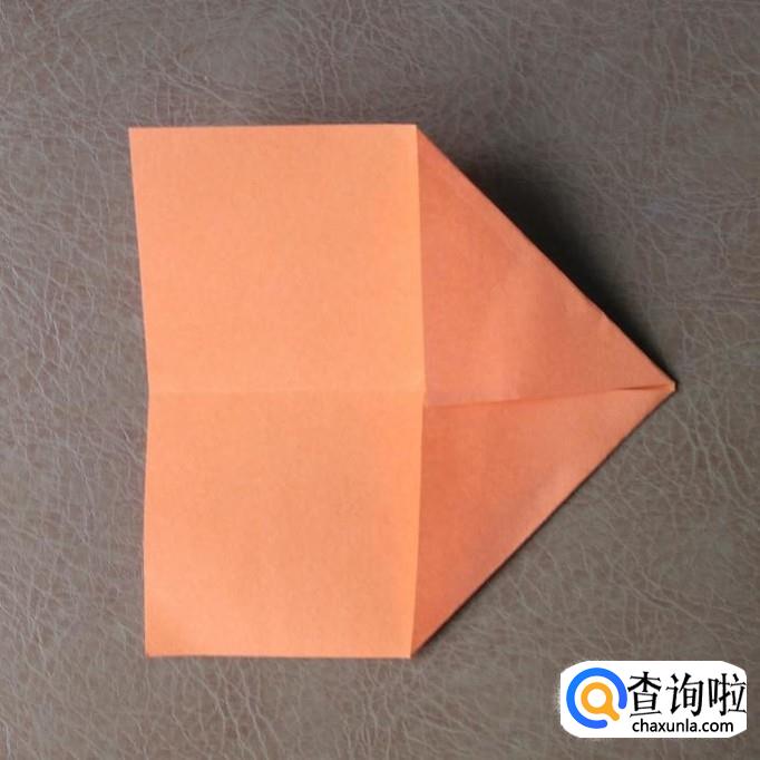 把橙色正方形纸沿中心线对折后打开,然后将右侧上下两面分别折向中心线。