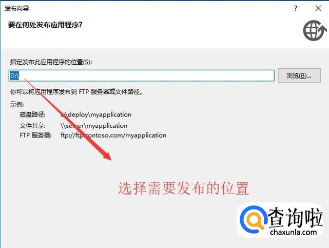 接着会弹出发布向导,首先会让你选择要发布的位置,这里选择一个盘符下的文件夹即可,如下图所示
