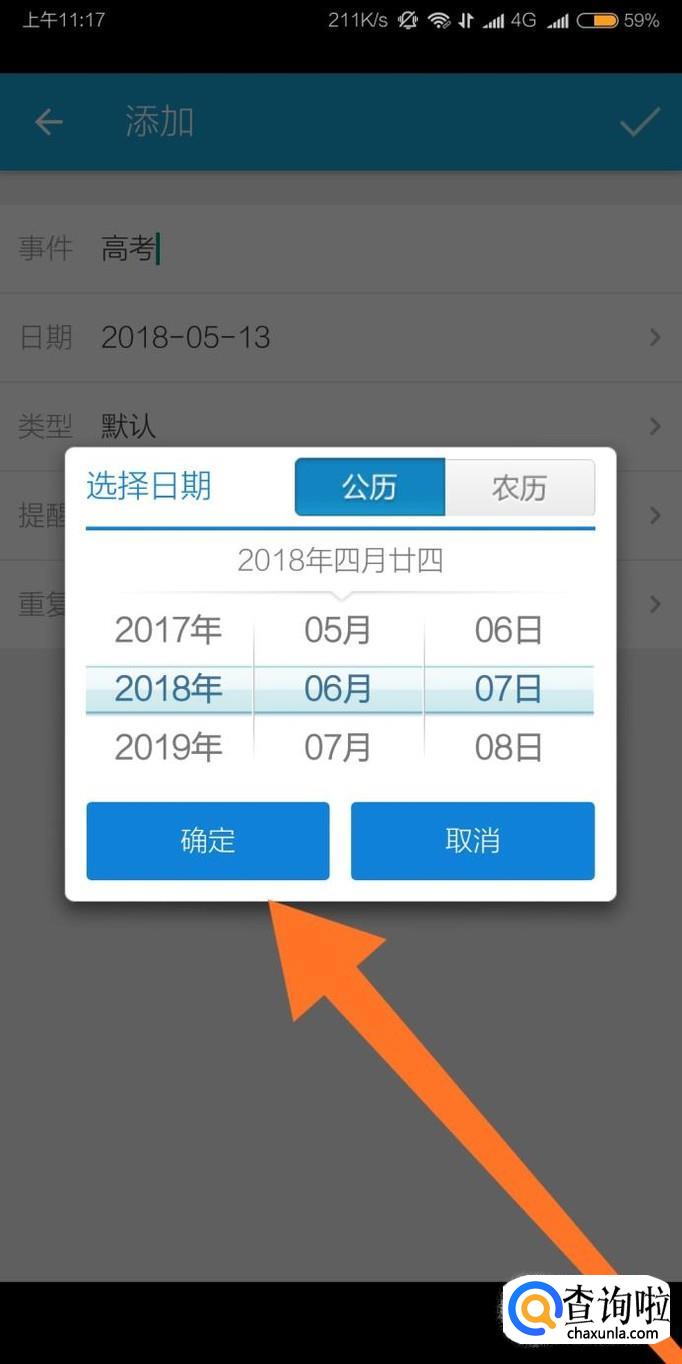 然后输入倒数日事件的名称和时间,点击“确定”即可添加完成。