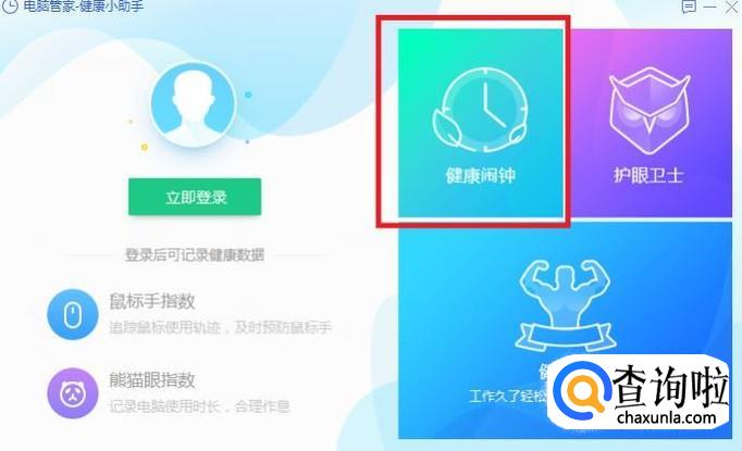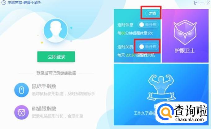 打开健康小助手后,将鼠标移动至“健康闹钟”处,打开“定时关机”对应的开关选项,并点击右上角的“详情”按钮。
