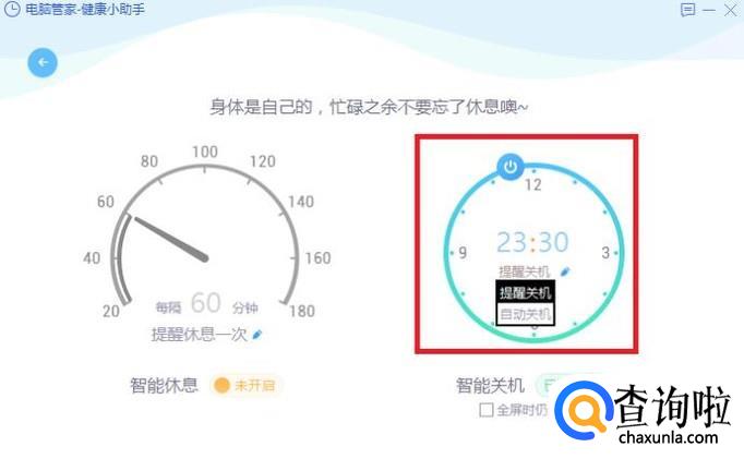 在界面右侧的“智能关机”中,设置好关机的时间后,点击“提醒关机”按钮,在拓展选项中选择“自动关机”即可。