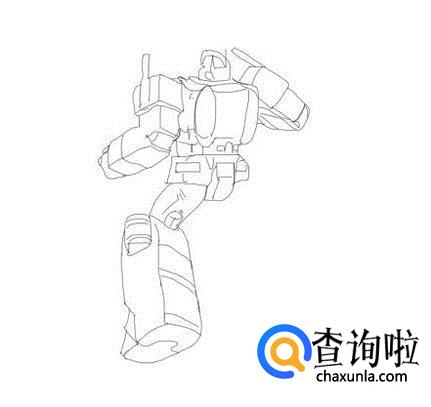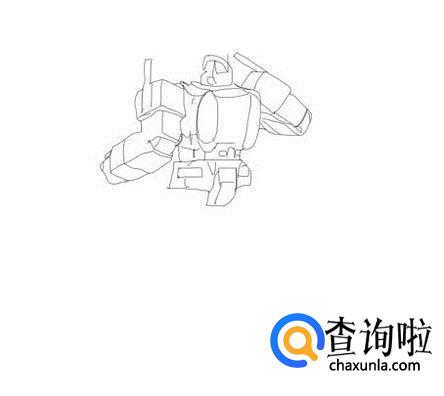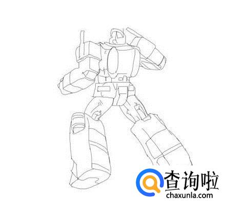 最后再在变形金刚的身体的下面右侧位置画出变形金刚的右侧的腿部及变形金刚的脚部,这样变形金刚简笔画就画好了,如图所示: