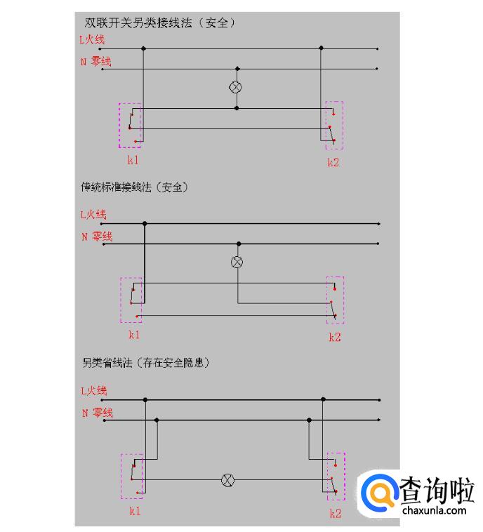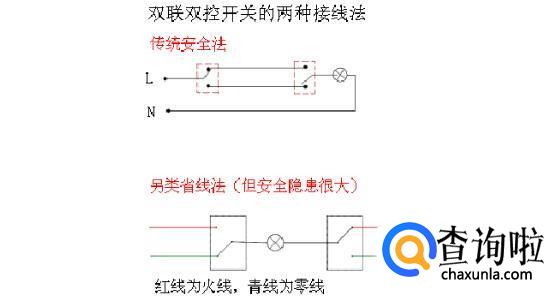 双联开关电路另类接线法(两个开关都入火线,安全)接线要点: