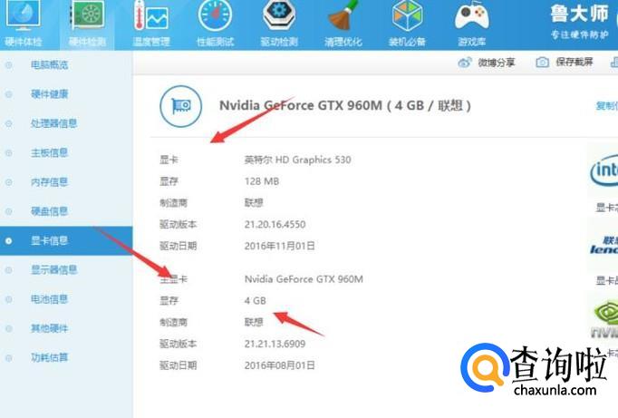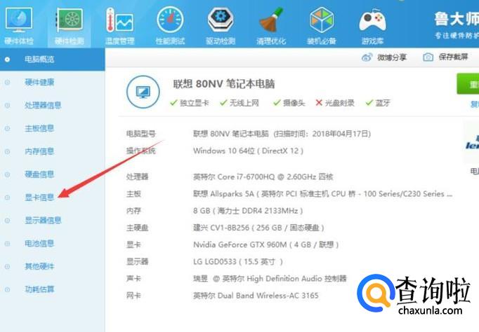 然后在鲁大师里打开硬件信息,找到一个显卡信息。