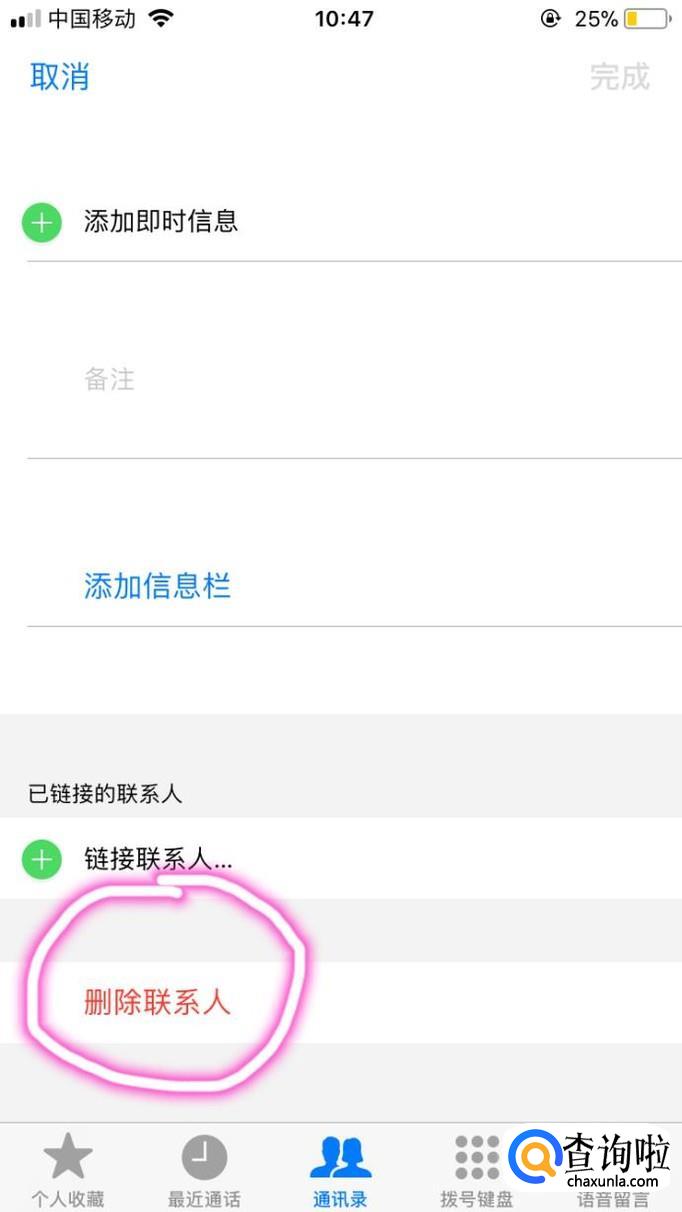 点完之后,把点开的页面滑到最底端,你会看见非常醒目的红色字体“删除联系人”,最后点击该字即可。