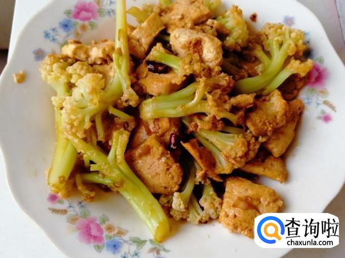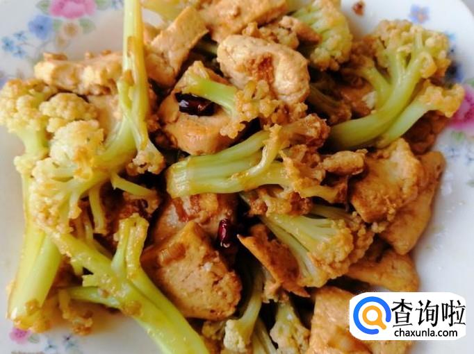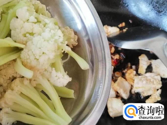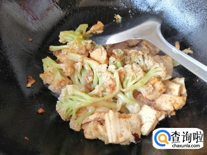 这两食材都是熟的,所以放进去翻炒均匀就OK,先加入豆腐,随后加入烫好的菜花就好。