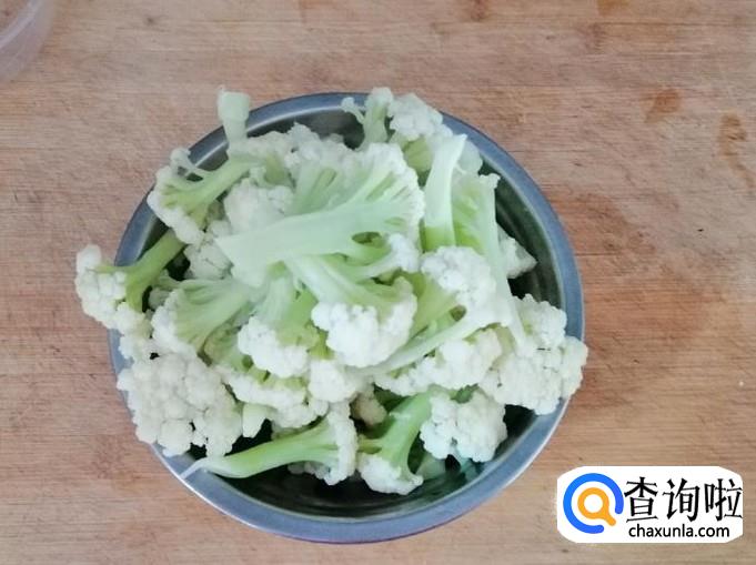选取新鲜的菜花一个,放入青菜盆中用清水洗净,菜花最好用盐水泡一会,去掉农药残留,把洗净的菜花切成小块待用。