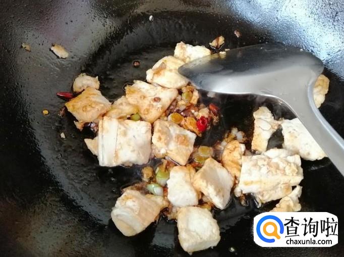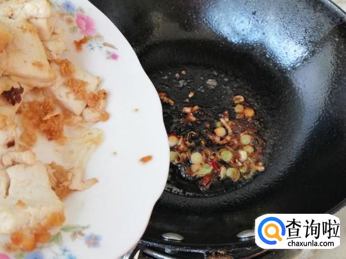 另起炒锅放少许油,油热后放入备好的调味品,炒香后放入生抽少许盐,然后倒入煎好的豆腐翻炒均匀。