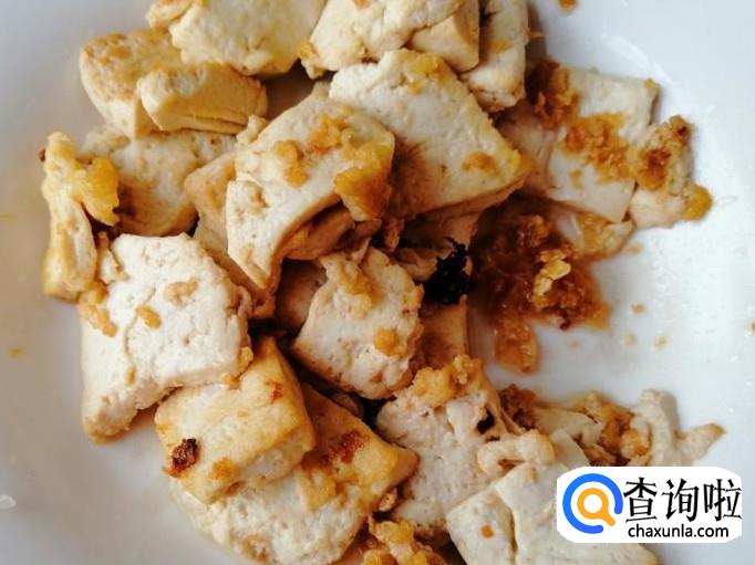 炒锅放油油热后,放入切好的豆腐,把豆腐煎至两面微黄,煎好后放入姜末出味,早放姜容易煎糊了,姜出香味后关火,把煎好的豆腐出锅入盘。
