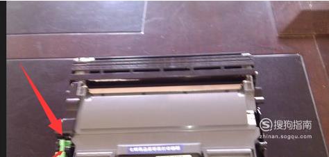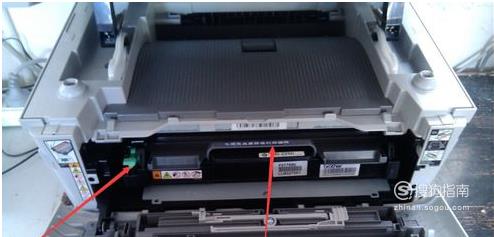 将打印机前盖打开。按一下箭头所指的地方,就可以把粉盒拿出来了。