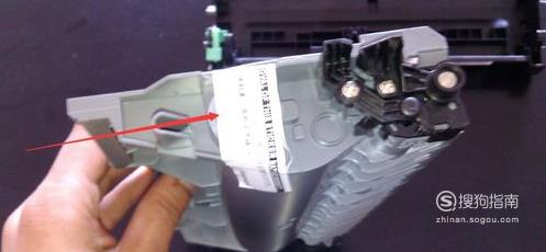 拿起其中的硒鼓,如下图:将箭头所指的地方封条撕掉,打开盖子。