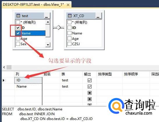 接下来我们选择每个表中要添加的字段,直接勾选字段前面的复选框即可,如下图所示,勾选以后,字段自动添加到视图列中