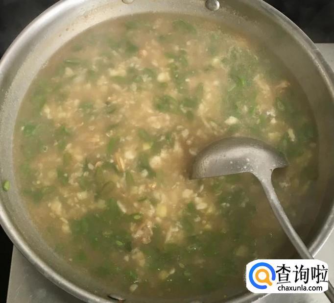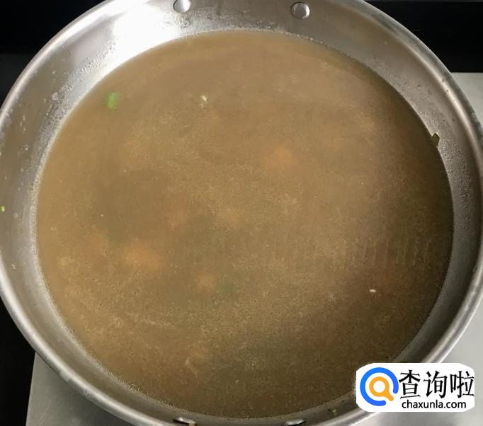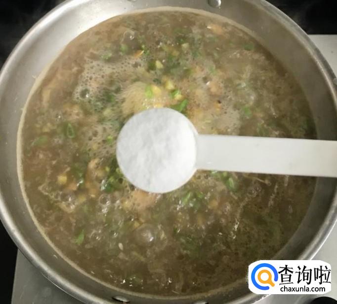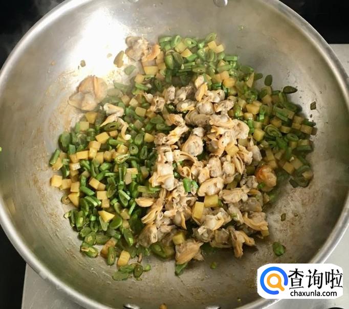 倒入蛤蜊肉、汤和适量的清水盖好锅盖煮至沸腾