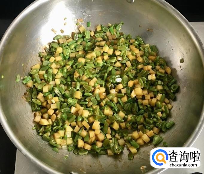 热锅加入适量的花生油放入葱花爆香,倒入土豆丁和豆角段翻炒均匀烹入生抽继续翻炒均匀