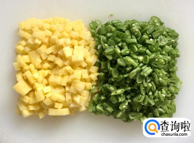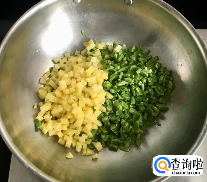 豆角择去两端、土豆削去外皮浸洗干净,分别切成土豆丁和豆角段。