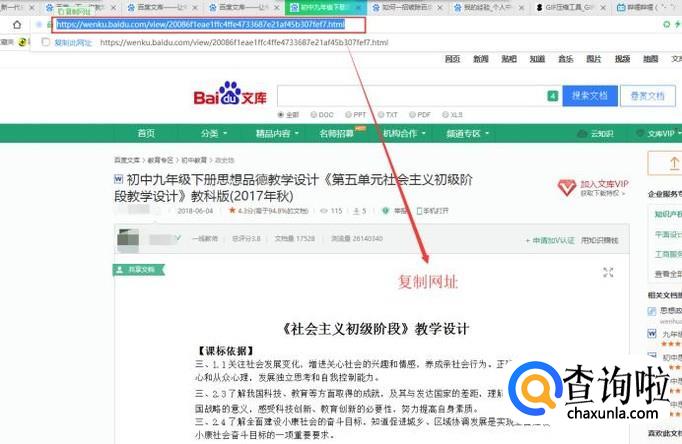 找到当前百度文库的网页地址栏,在网页地址栏中选中当前百度文库的网页地址,然后选中该地址,右键鼠标选择复制该网址。