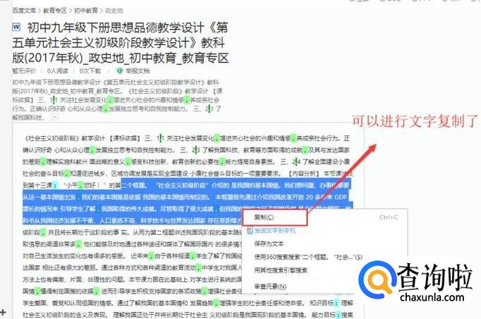 点击百度快照之后,会打开另一个网页,这个时候我们就会看到我们之前的百度文库的内容都在这里了,并且这时候选中我们要复制的文本内容,右键复制,然后粘贴就可以看到我们已经复制得到了我们想要的内容。到这一步,我们就轻松破除了百度文库不能复制的问题。