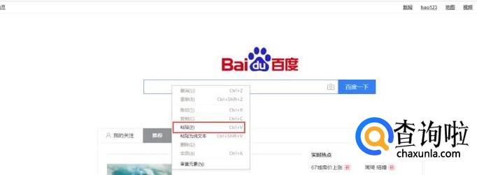 打开百度的首页,在百度一下的搜索框中,右键鼠标,将我们上一步中复制的百度文库的网页地址进行粘贴到百度的搜索框中。