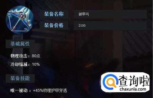 对于橘右京来说,必要的一件装备就是破甲弓了,不管是什么出装方案这都是必出的,而且是优先,能够提升物理伤害和物理穿透。