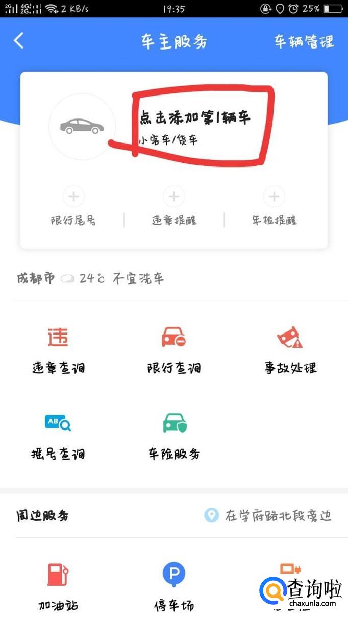 在车主服务中,可以选择添加车辆信息。