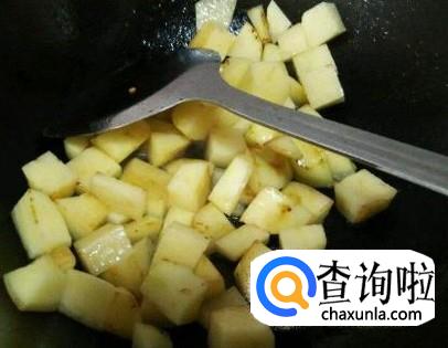 将土豆块放入锅中,翻炒均匀。