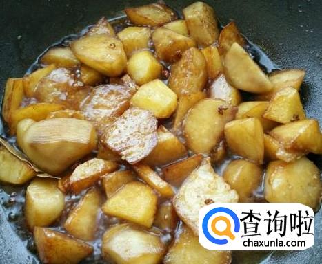 在锅中加入适量的酱油、盐和清水,中火慢炖,等锅中的汤还剩少许、土豆软烂时,就可以出锅了。