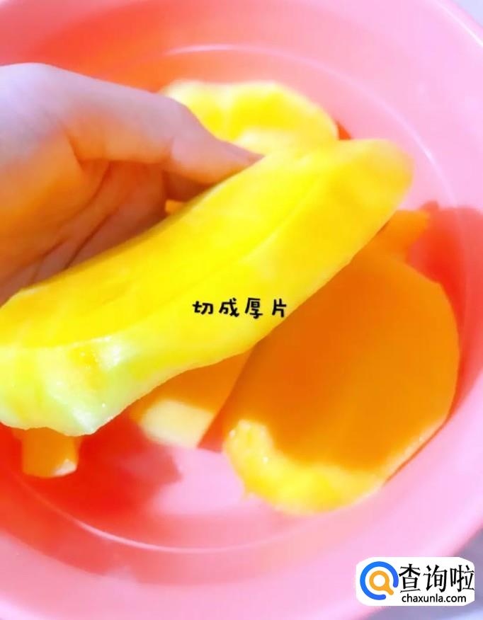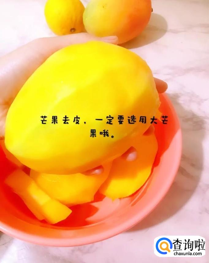 首先将芒果去皮,如下图所示。小贴士:关于芒果的选择,小编建议大家最好选用大芒果会比较合适。