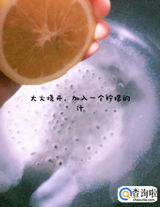 然后开大火烧开,加入一个柠檬的汁,如下图所示。