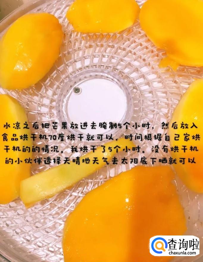 然后把刚才熬好的糖水放凉,之后把芒果放进去浸泡五小时,接着把泡好的芒果放到烘干机烘干,我是用了五个小时左右,大家可以参考一下。