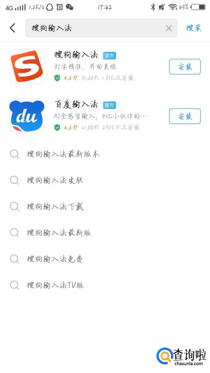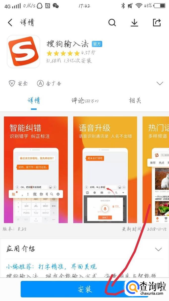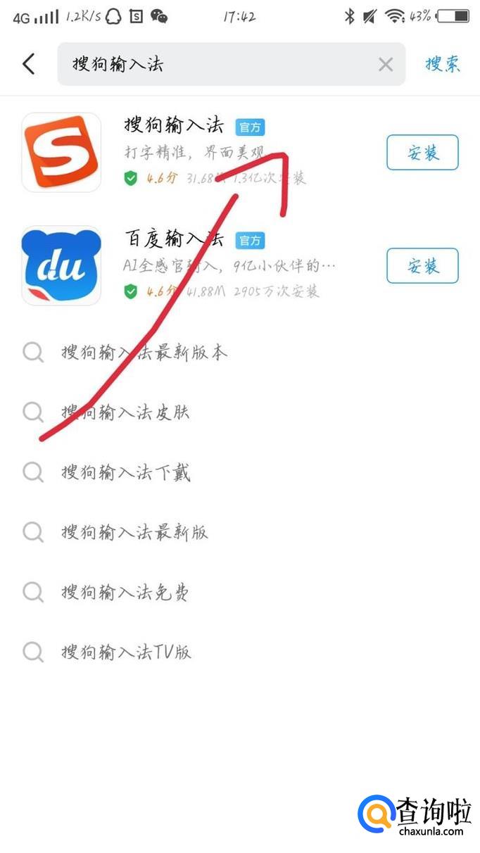 点击“搜狗输入法”下方的“安装”选项,如图1箭头所示。下载完成之后就会自动安装了。