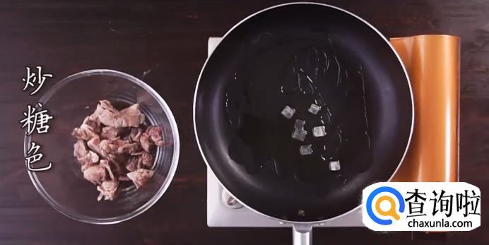 热锅起油,下冰糖炒化了,起糖色,将排骨倒入锅中翻炒上色。