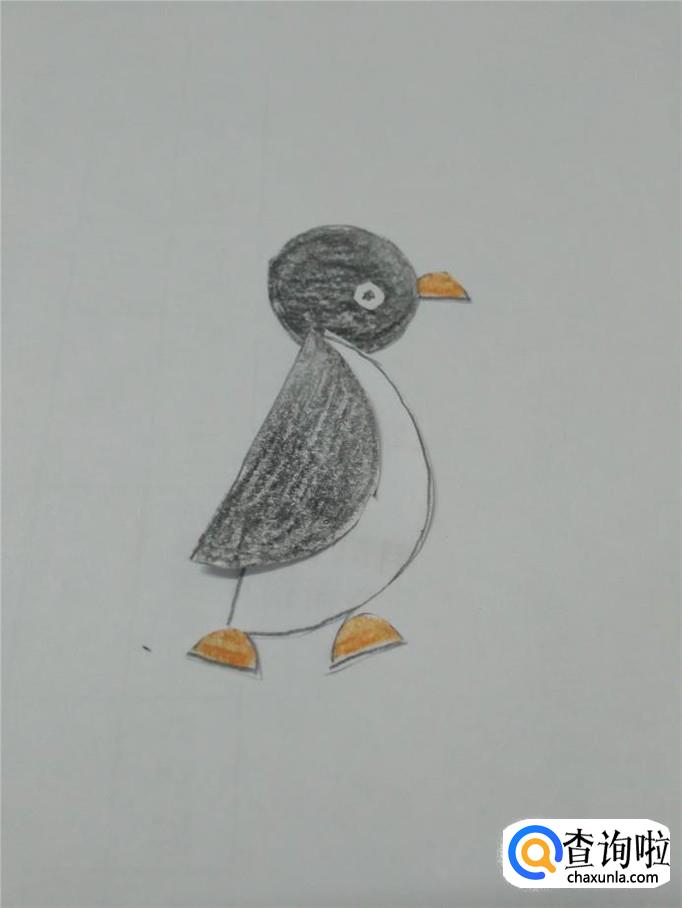 把剩下的两个小的桔色半圆粘在白色身体下方,当作两只脚,卡通企鹅就做完了。
