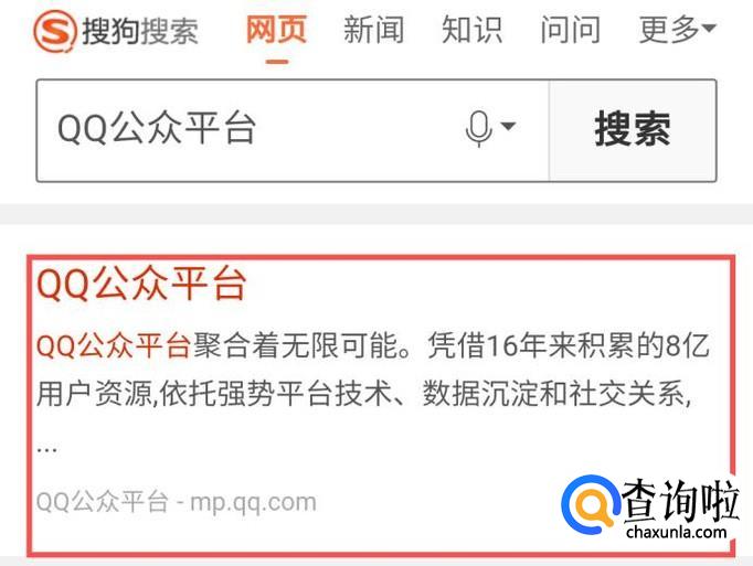 我们先在搜狗浏览器上搜索“QQ公众平台”,点击进入第一个网址。