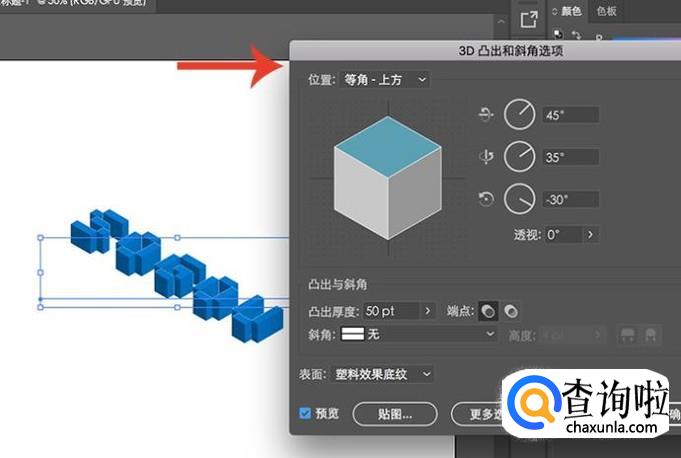 进入3D凸出和斜角选项设置界面,将位置选择为“等角上方”,调整凸出厚度,点击“确定”
