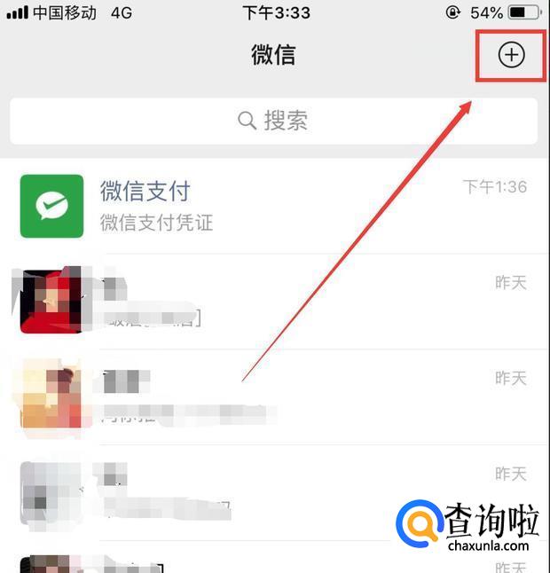 进入微信后,点击右上角的+号。
