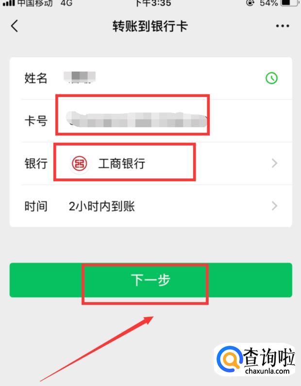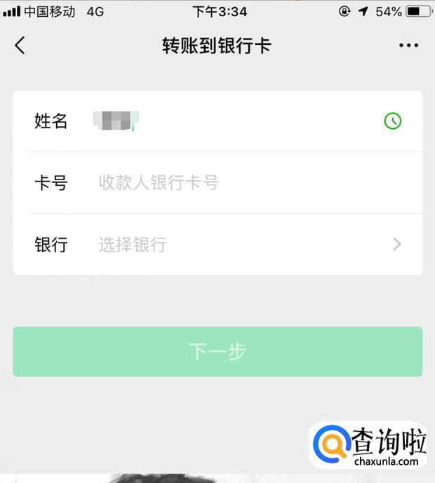 名字和卡号输入完毕后,点击银行,然后会显示出要转账的银行,选择下一步。
