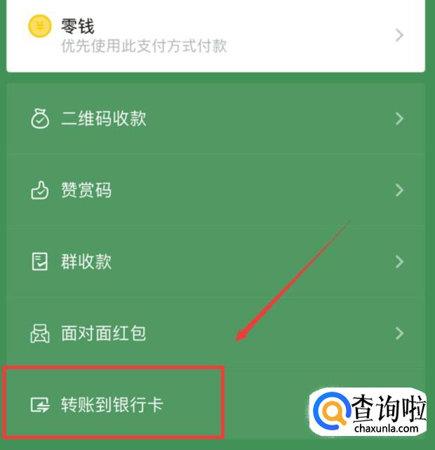 在收付款界面里,下拉到底部,选择“转账到银行卡”。