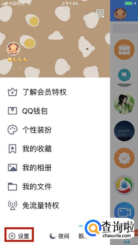 我们先把手机QQ打开,然后我们想要向左滑动屏幕来进入个人选项中。然后我们点击左下角的“设置”按钮。