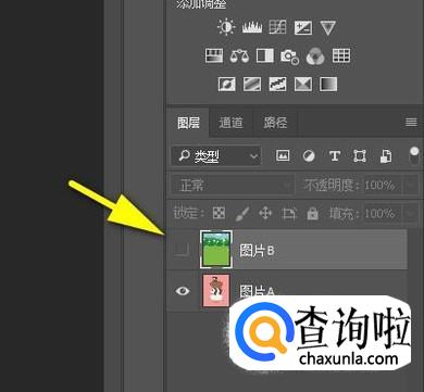 把图片A与图片B分别拖入到PS中。把图片B这一层眼睛关闭。