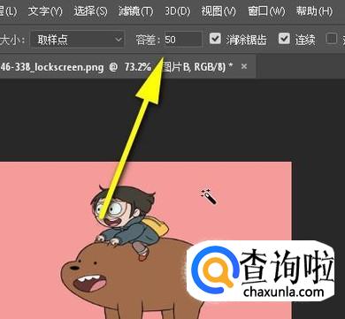 选中图片A这一层;再调出魔棒工具,设置其容差值;然后,鼠标在图片A背景上点击一下,把背景选中。
