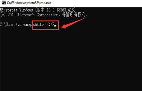 接着又会弹出一个新的窗口,我们在后面输入【chkdsk H:/R】,其中H代表U盘的盘符,确认输入无误后,再按回车。
