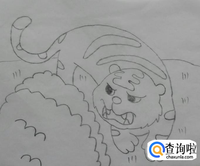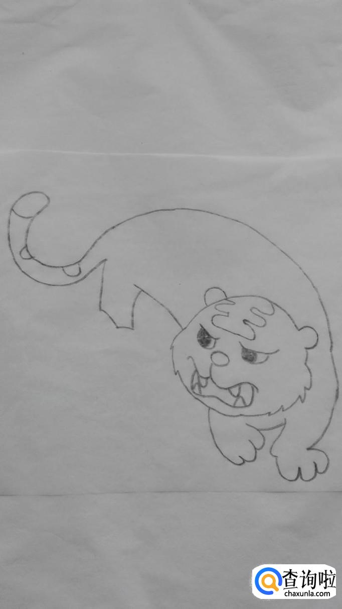 用弧线画出老虎的身体轮廓,用曲线画出老虎露出来的后腿的轮廓。如图所示: