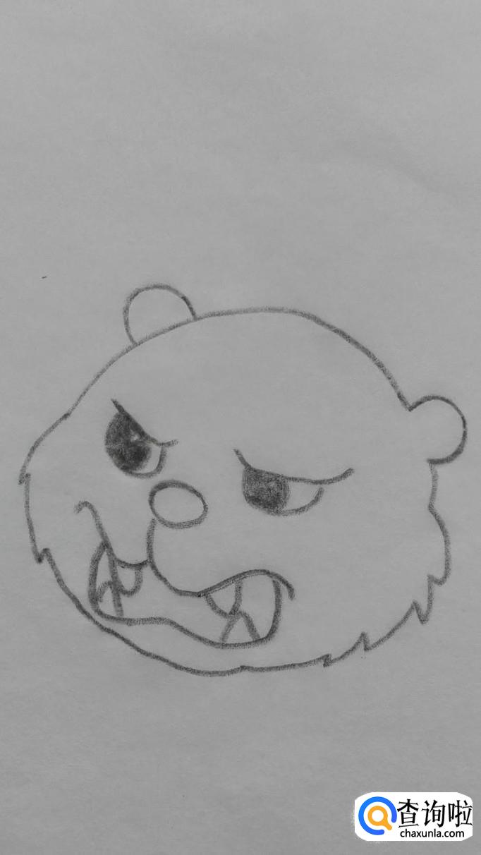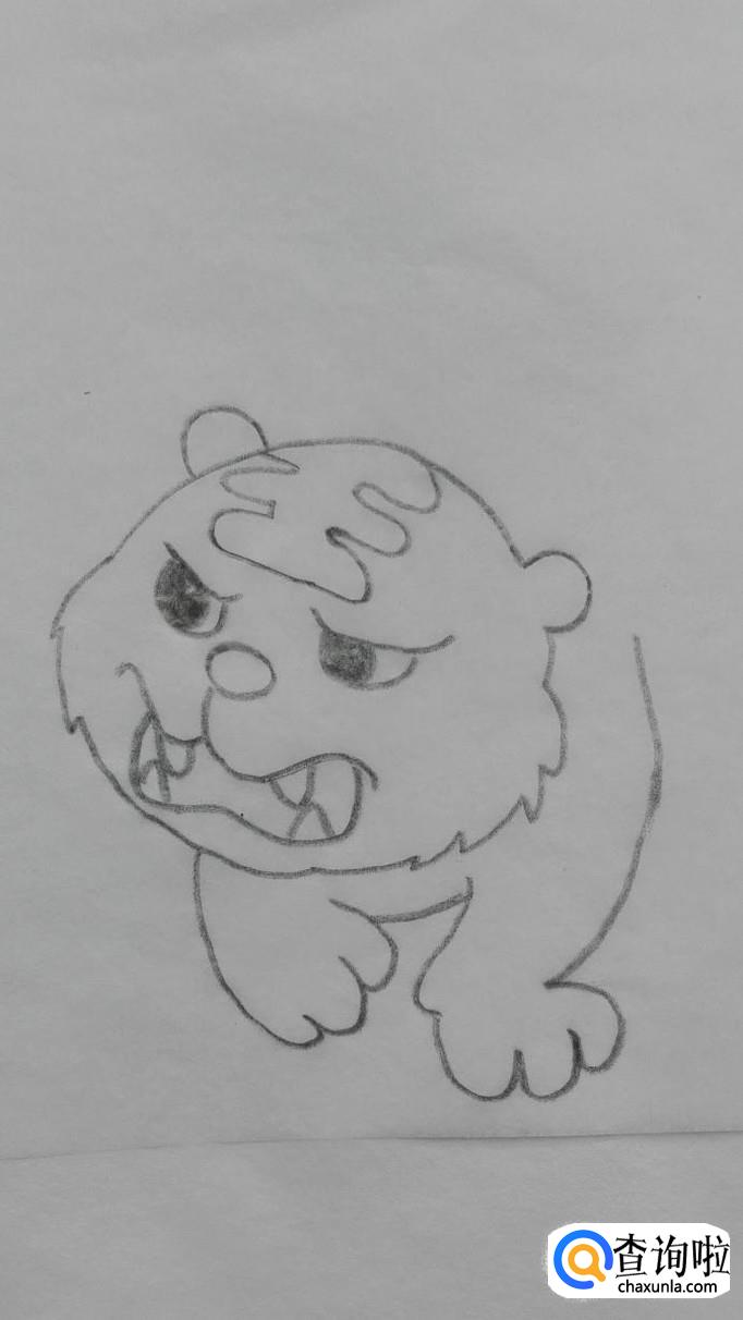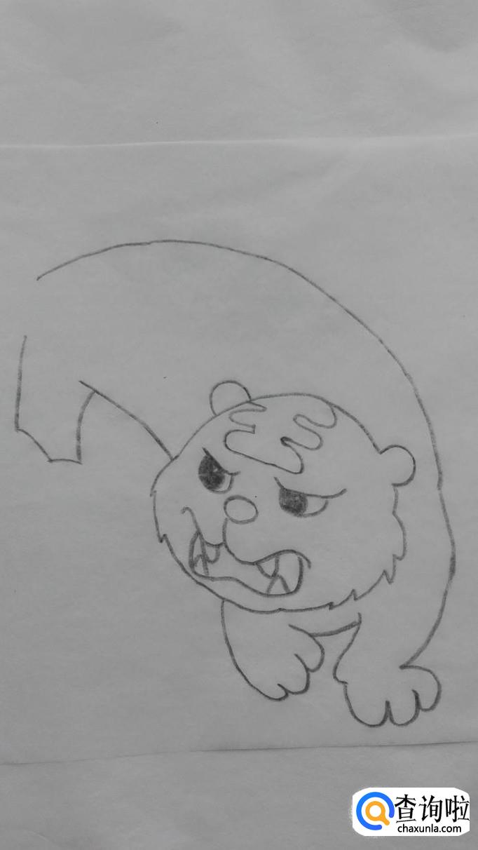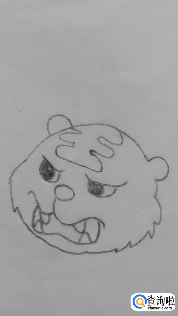 用曲线画出老虎的头部轮廓,毛飞起的地方用折线画出来。用半圆画出老虎的耳朵。如图所示: