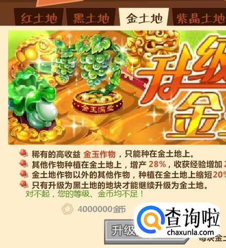 最后点击升级为金土地就可以了。想要把自己QQ农场的土地升级为金土地,必须等级和金币足够的情况下才能升级。